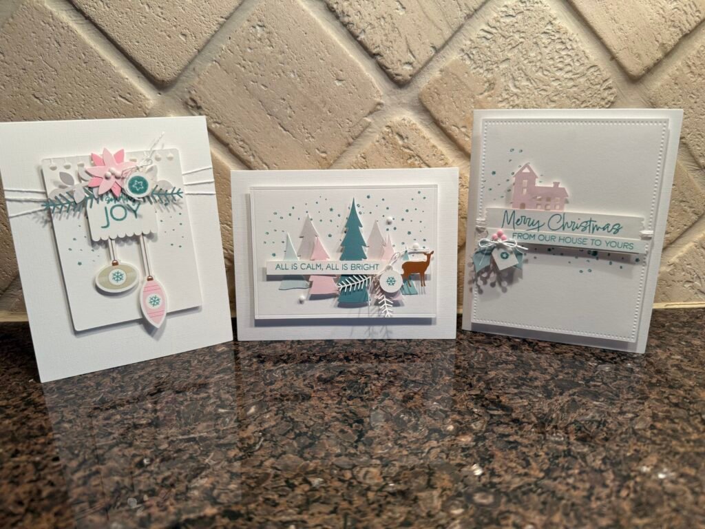 I love Stampin’ Up! kits. They are an all inclusive kit, everything is included except scissors. This Calm & Bright kit is absolutely lovely. It is a clean and simple design style paired with a soft colour palette. This kit makes 3 each of 3 cards, for a total of 9 cards. The kits also make great gifts!