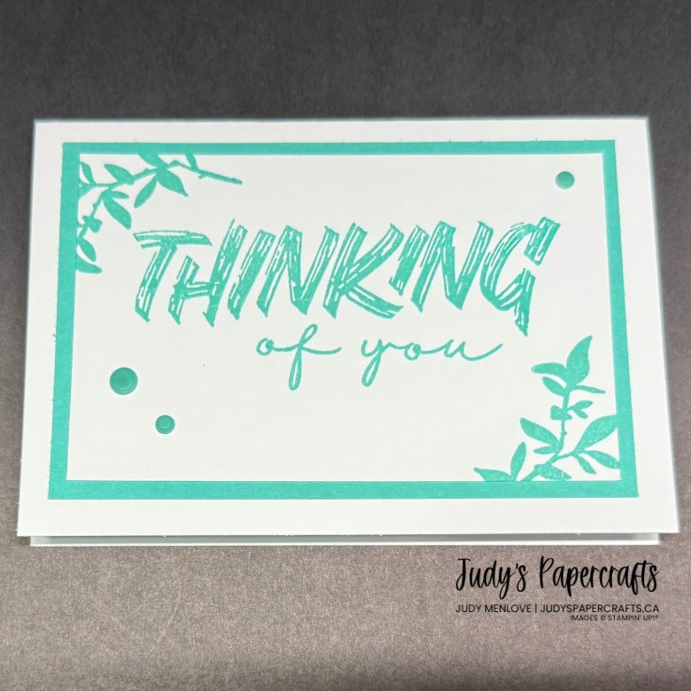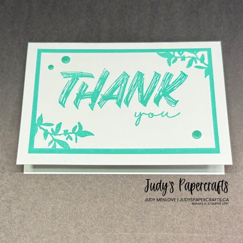 I adhered some Summer Splash cardstock 4 1/2″ x 3″ to the note cards. I took a piece of Basic White, 4 1/4″ x 2 3/4″ and stamped a sentiment from the Layered Thoughts Stamp Set in Summer Splash ink. I also stamped the small leaf branch from Nature’s Symphony Stamp Set in Summer Splash, then I adhered to the note card. I repeated this with all 4 of the sentiments in the Layered Thoughts stamp set. I added some retired embellishments in Summer Splash, 2024-2026 In Color Resin Dots.