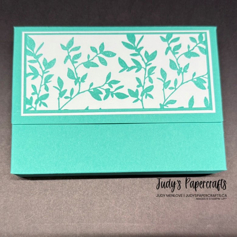 The top of the box was decorated with a 4 7/8″ x 2 1/4″ piece of Basic White, then a layer of Summer Splash 4 3/4″ x 2 1/8″. I stamped a piece of Basic White 4 5/8″ x 2″ in Summer Splash ink with the large branch die from Nature’s Symphony. I had to stamp it twice to fit across, then I added to the top of the box. The box stays closed with a small magnet 8mm x 1mm Neodymium I purchased from Amazon.