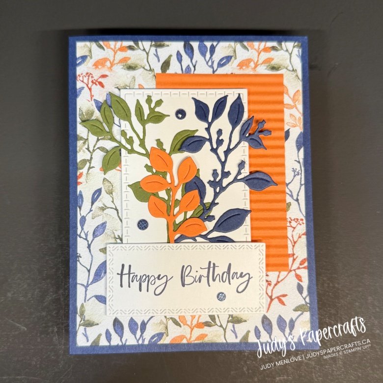 I created this card with a Night of Navy base and layered it with a 4″ x 5 1/4″ piece of Designer Series Paper. I added a strip of Timid Tiger cardstock, embossed with the Mini Corrugated folder, for some fun texture. Next, I die cut a piece of Basic White using the 4th largest die from the Textured Notes set and adhered it to the card front. I cut a few leaves in Mossy Meadow, Night of Navy, and Timid Tiger, then arranged and popped them up with Dimensionals for extra depth. The sentiment is stamped in Night of Navy, die cut with Textured Notes dies, and also popped up with Dimensionals. To finish it off, I added three gems from the Charming Shimmer Faceted Dots for just the right touch of sparkle.
