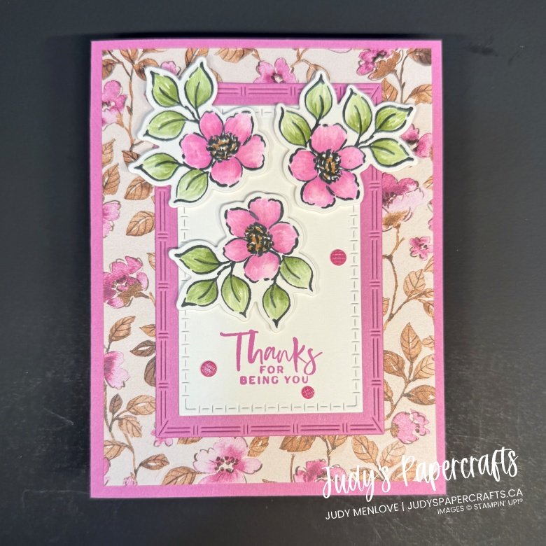 This pretty card starts with a Petunia Pop base, 8 1/2″ x 5 1/2″, scored at 4 1/4″. I added a 4″ x 5 1/4″ layer of Designer Series Paper for a pop of pattern. Both the Petunia Pop and Basic White center panels were die cut using the Textured Notes dies and layered onto the card front. The sentiment is stamped in coordinating Petunia Pop ink to tie it all together. I stamped the flowers in Memento Black on scraps of Basic White. Then, using a small acrylic block inked with Petunia Pop, I used a Blender Pen to colour the flowers, then added some Wink of Stella. The leaves got the same treatment using Mossy Meadow. After die cutting the flowers and leaves, I added them to the card with Dimensionals for a bit of lift. And of course, I couldn’t resist finishing it off with three Charming Shimmer Faceted Dots for a little sparkle!