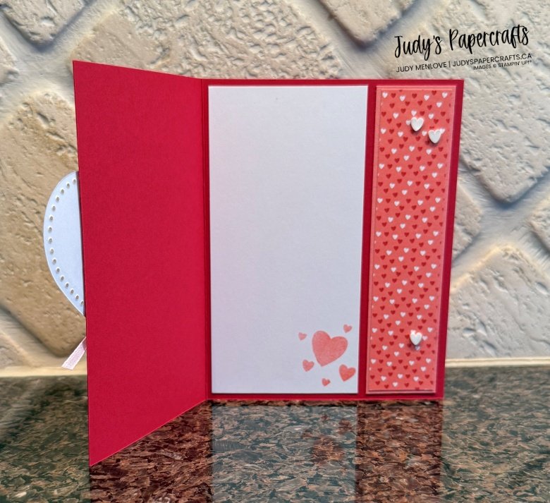 Cut a piece of Flirty Flamingo 1 1/4″ x 5 1/4″ and add to inside where the 1″ was cut off, then adhere DSP 1 1/8″ x 5 1/8″. Cut a piece of Basic White measuring 2 5/8″ x 5 1/4″, using the multiple hearts stamp, stamp off with Flirty Flamingo ink, then ink bottom right corner and adhere to inside of card.