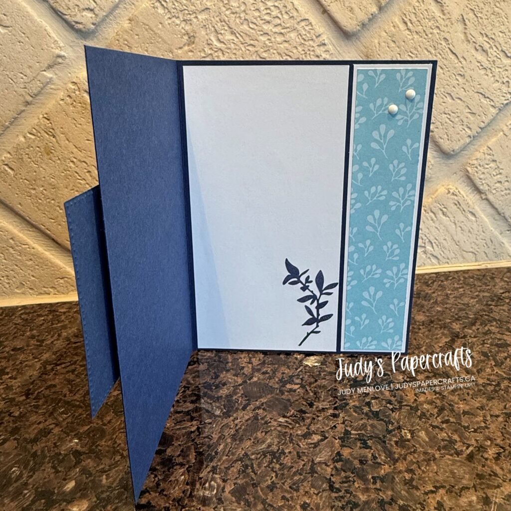 I started with a Night of Navy base, 8 1/2″ x 5 1/2″, scored at 4 1/4″, then I cut 1″ off the side.