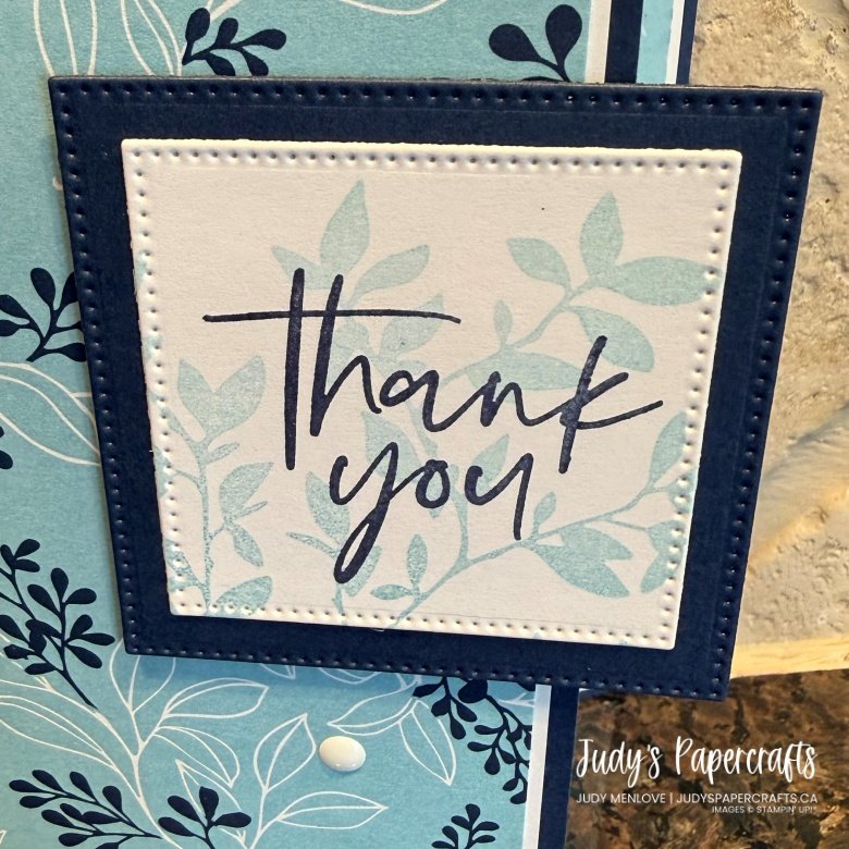 I cut a piece of Night of Navy and a piece of Basic White using the Stylish Shapes dies. Using Balmy Blue ink and the large leaf stamp from Nature’s Symphony, I stamped off once, then stamped on the square white piece. The sentiment is from Fabulous Sayings stamp set and is stamped in Night of Navy. I glued the two squares together and then added to the card with Dimensionals, taking care that it was positioned only on the left side of the card.
