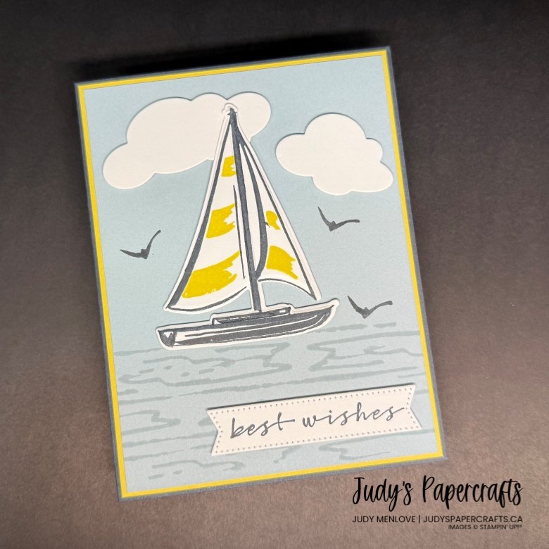 The cards are simple enough for a beginner but have lots of little details that make it extra special. The bright yellow sails against the calming sea tones just pop off the card. And those fluffy clouds? They add the perfect touch of dimension and whimsy. Let’s take a closer look at each of the cards.