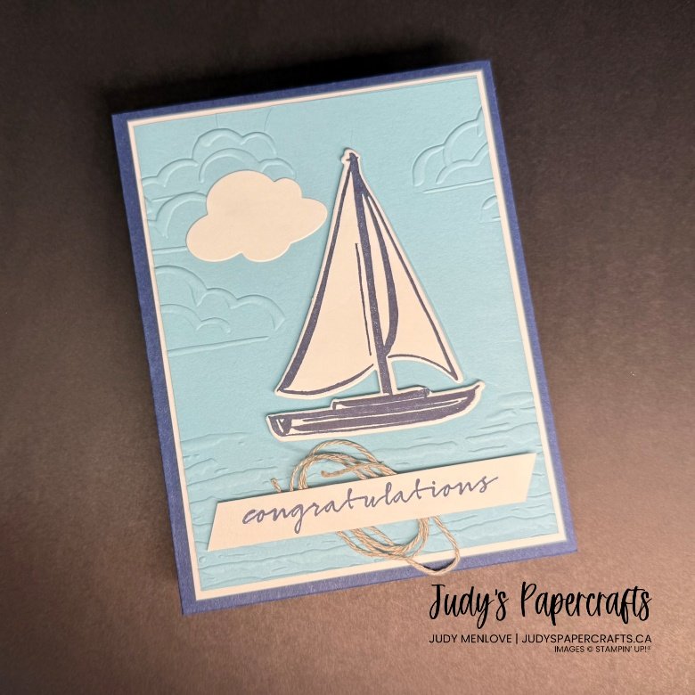 This card was designed by Amanda Batek, (Amanda the Hoppy Stamper) and I first made it during a shoebox swap at a BBQ get together. I liked it so much I thought I would copy and share. Base card is Night of Navy, 8 1/2″ x 5 1/2″, scored at 4 1/4″. On a piece of Basic White 4″ x 5 1/4″ stamp the sailboat in Night of Navy and die cut. Glue the Basic White piece to the card (even though you’ve cut the boat out from the middle you won’t notice it as you’re still adding another layer). Emboss a piece of Balmy Blue cardstock 3 7/8″ x 5 1/8″ with the embossing folder and adhere to card. Now take the die cut sailboat and glue to card right on top of the embossed sailboat. Add a white cloud. Sentiment is stamped in Night of Navy and just diagonally cut edges. Adhere some twine to the back of the sentiment and then add to card with Dimensionals.